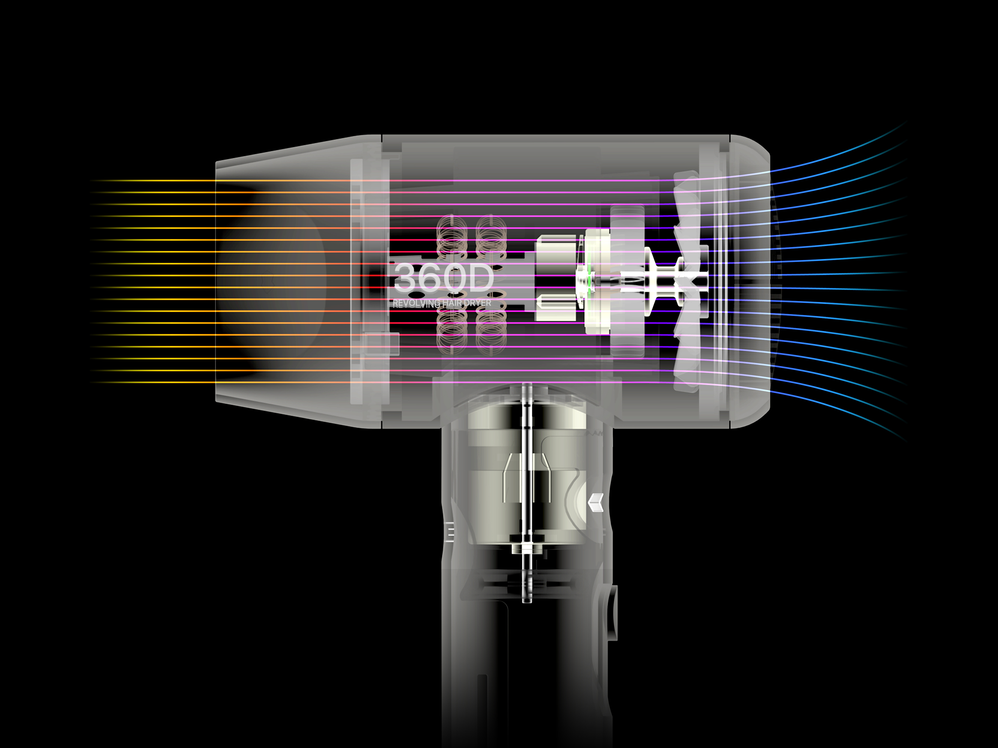 The 360 Dryer dramatically reduces the length of the vent and allows the dryer head to rotate approximately 360 degrees. This allows you to style your wrists and arms naturally without changing your grip position.